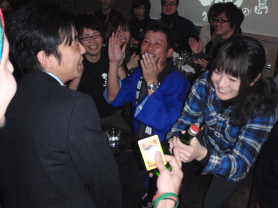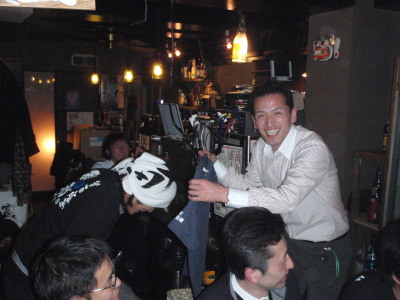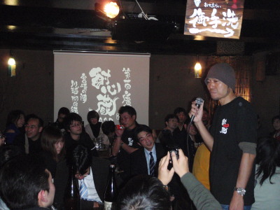 焼酎クイズ〜利き焼酎大会〜プレゼント大会! 大盛り上がりでした! プレゼントは・・・ 酎心蔵賞:川越、青鹿毛、川越Tシャツ、赤鹿毛前掛け、焼酎楽園最新号 川越賞:金の露、川越Tシャツ 柳田賞:赤鹿毛、赤鹿毛前掛け その他、上記以外に川越酒造場さんと柳田酒造さんに頂いた、川越はっぴ2枚、川越Tシャツ4枚、赤鹿毛前掛け3枚 で、酎心蔵より・・・川越Tシャツ3枚、赤鹿毛前掛け1枚、焼酎楽園17冊 大しょう酎より・・・金の露、大しょう酎Tシャツ2枚に川越Tシャツ なんか勢いでプレゼント大放出でした! マジ、お客さんとして参加してみたいです! |
