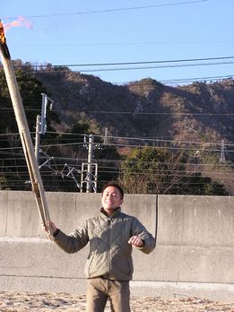 もっさん、なんか変な絵ですが焚き火にあたってます。 |