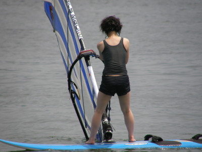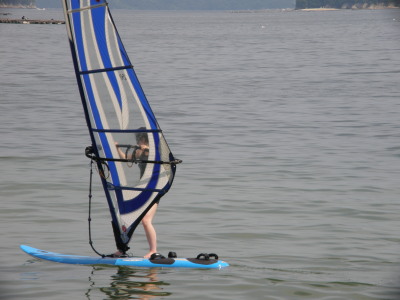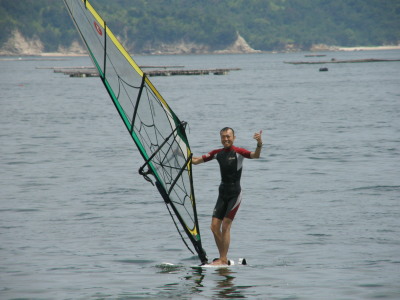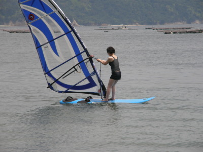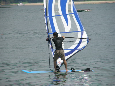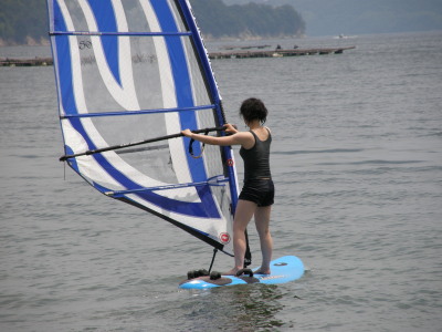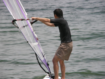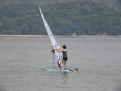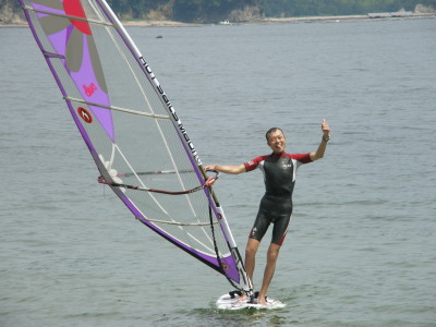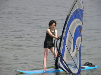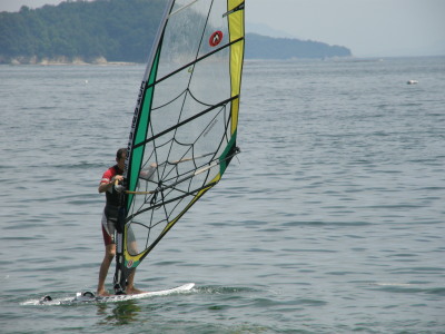 2008 07 06(日) 南西0~2m/s 3月に海で出会い、4月にはウインドしたいと連絡があり、そして本日やっとナルーに来て一緒にウインドが出来ました! で、早速、ナルー人の仲間に入りです! かなり、ノリの良いティーンズな女子です!(実は41の娘と言う噂も有り・・・笑) そして、元気な今ナルーで一番アツイ男、タカノブもやって来ました! この二人ナルーの期待のホープです!将来が楽しみです! 今日は、先日に続き、この楽しいメンバーと一緒にまたまた、牡蠣イカダまで行き海遊びしました! まさに、スタンドバイミー! おっと、ゴジーいきなり登場! |