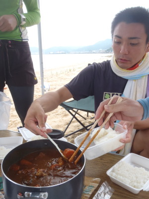 昼は昨日のダッチオーブンでボイルしたジャガイモ、 タマネギ、ニンジン、豚肉使ってカレーライスです。 |