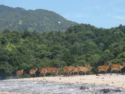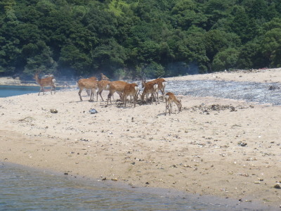 宮島須屋浦海岸に来ました。 始めてみる鹿の大群に遭遇! 牡蠣イカダを焼いていて、その焼けた後の貝を食べてるみたいです・・・ 大潮っぽかったしね。