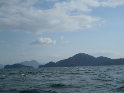 りえちゃん、ここまで良く来たね〜〜! 宮島沖からの可部島とりえちゃんです。