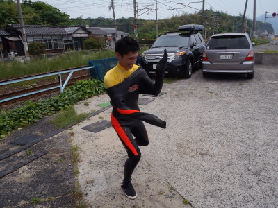 セクシー初フルスーツへのお着替に苦戦中。 おもろい動きじゃ(笑)