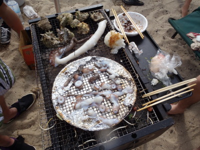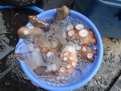 さすがプロの料理人、あのどデカイタコも 一流料理人の腕に掛かると訳なくさばかれます。 生たこ刺身、ボイルたこ刺身、たこしゃぶ、たこ焼きBBQ ・・・食べきれませんでした。 帰ってからのお楽しみです♪ |