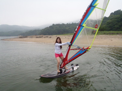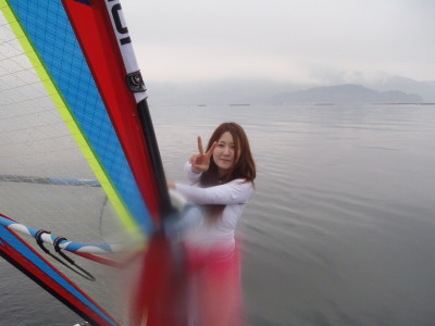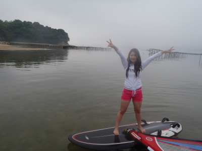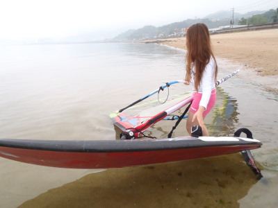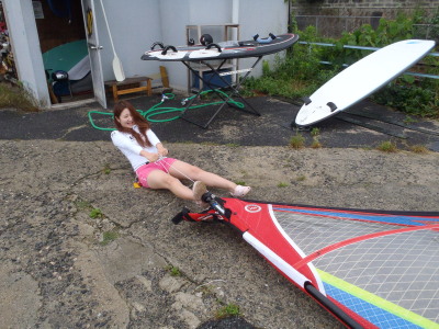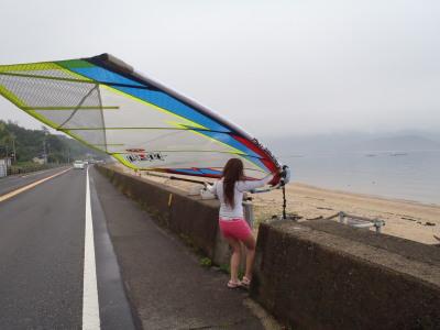 ナルー前は大阪〜福岡を結ぶメイン道路の国道2号線です。 車が切れる瞬間に道具を運ばないといけません。 風があるときは、セイルが暴れないようにしないといけないのでビギナーさんには大変です。 BUT、怖がらずに道具運びをチャレンジするみづきちゃん ステキデス☆