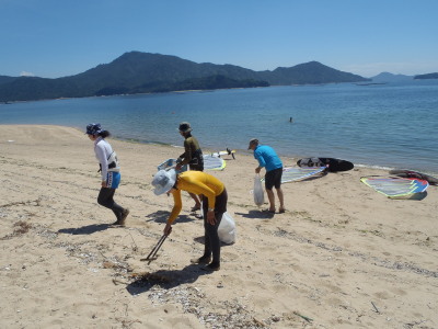 明日の宮浜温泉まつりウインドサーフィンスクールに備えて ビーチクリーンです。 海をキレイにしましょう!