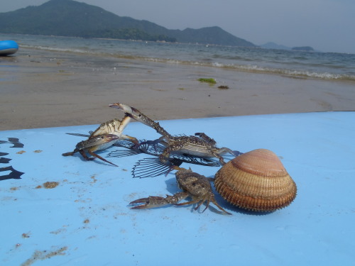 今日もおつかれさまでした・・・ カニVSカニ 観客カニ&ドデカハマグリ、そしてトビウオでした・・・ |