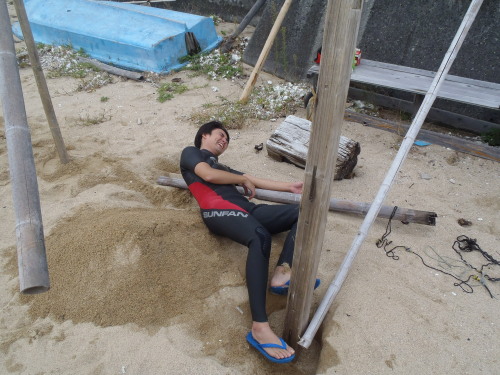 2013 10 19(土) 北北東3〜5m→東微風 午前中は北東の風が吹いていましたが、結局上がりませんでした。 タカノブと一緒にナルービーチハウスのリニューアルしました。 台風で足が折れてました。 | ||