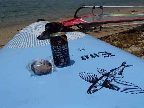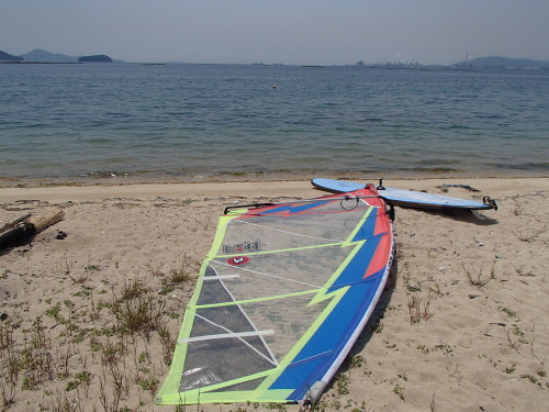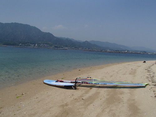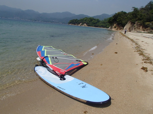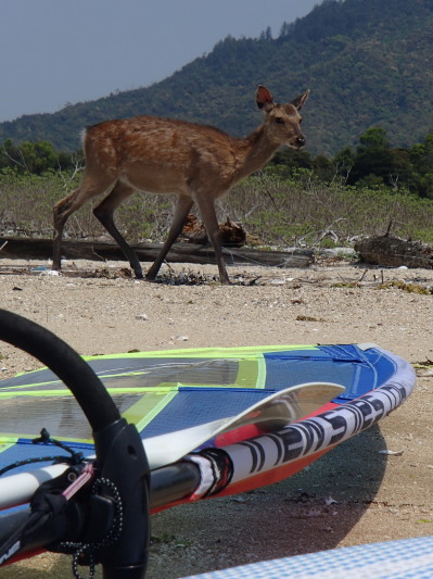 2014 05 17(土) 南西2〜5m/sのち南東0〜1m/s 吹かないと思いながらも意外にも昼前後に吹きました。 120L+7.0でプレーニングコンディションでした♪ 今日は、宮島の長浦までウインドサーフィンで久しぶりに上陸です。 南西ながら西寄りの風でしっかりとセイルに風を感じるぐらい吹いたので 意外にも簡単に行けました。ナルーから45分ぐらいでした。早い方ですね♪ 到着すると、いきなり人類に遭遇! 宮島桟橋から登山道を通って3時間ちょっとで長浦にたどり着いたそうです。 天気も良かったので気持ちよかったでしょうね。 | ||