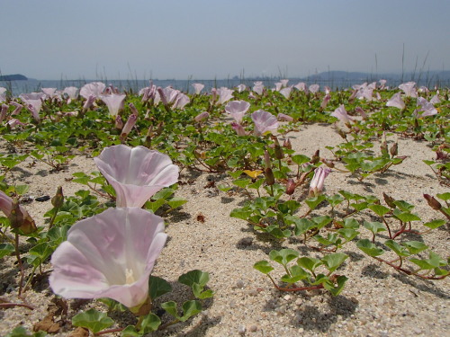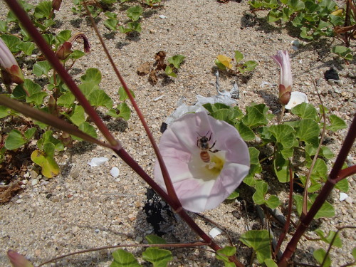 ミツバチが、次から次へと浜昼顔の蜜を吸っていました。 甘くておいしそう(*^_^*)
