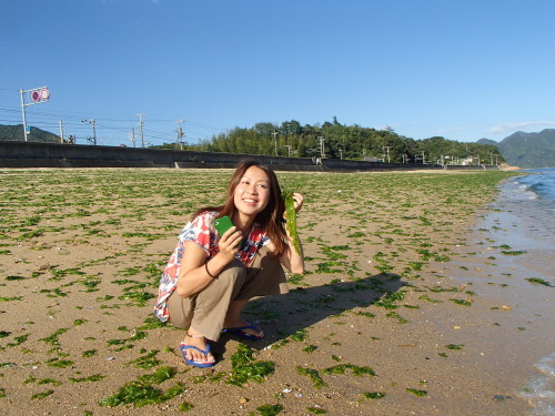 アオサの季節です。 ちえみちゃん、今日の晩御飯です☆ ビーチ、海、スマホが全てグリーン! バックの木ももちろんグリーン! 空はブルー! 風が吹いて、今が一番キモチよいナルーです。