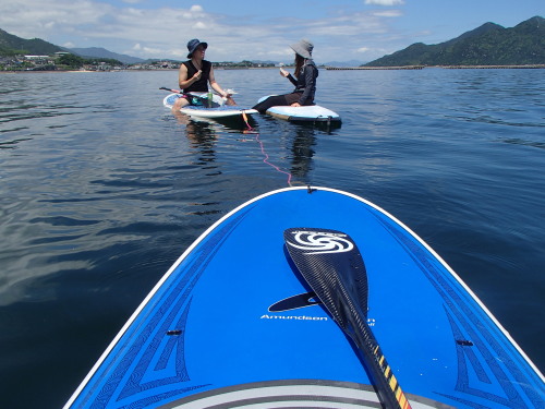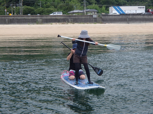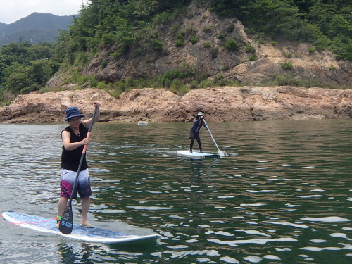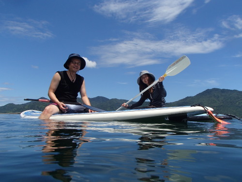 まずはタンデムSUPです。 微風ではバランスがとりにくいですが、慣れると強風では タンデムSUPの威力を発揮します。 女性は長距離クルージングがタンデムを推奨しています。 風が強くなると女性ではパワー不足で流されてしまいます。 安全第一ですね!