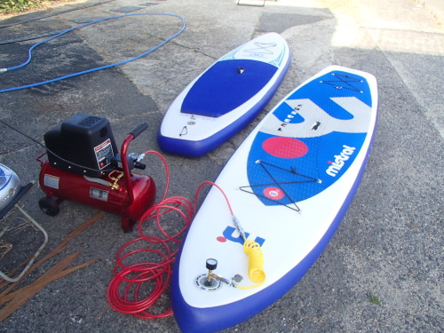 インフレータブルSUPにサイコーの助っ人登場! エアコンプレッサーGET! 3分でお腹いっぱいのフル満タンです! 車用コンプレッサーだと10〜15分掛かります。 これで最速で海に出れます!