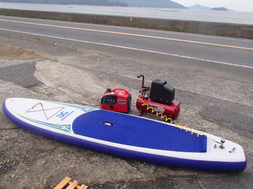 発電機とコンプレッサーが揃ったので、これで電気がなくてもどこでも 3分でSUPのエア入れが完璧!!! って、思ったら発電機のパワー不足でした・・・(≧▽≦)