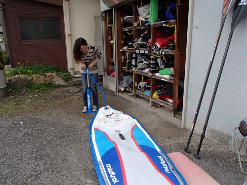さおりちゃん、ついにブランニューSUPをゲットです! ビニールをはぎ取る瞬間が堪らないですね~(*^_^*)