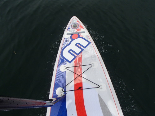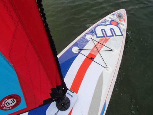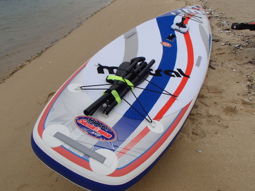 ワイドテイルボードなのでリグが完全にボート上に乗ります。 インフレータブルなので水面からボード面まで高さもあり海水に浸かる 事がないので抵抗なくSUPパドリング出来ます。
