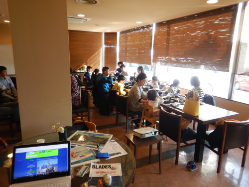 2017 12 03(日) 南0〜2m/s 今日はJTBさんと廿日市市さん主催の廿日市市移住定住モニターツアーの企画として ナルーでたくさんの廿日市市にご興味がある方々13名さまがナルーにやって来られました。 JTBさんのイベントで今回は廿日市市大野地区の魅力を感じて貰うために鳴川ビーチを 選定して頂きました。 大野と言えばナルー??? とまでは行きませんが、大野の魅了の一つとしてナルーに声をかけて頂き嬉しい限りです。 ナルーでBIG SUP体験を開催前に 協力頂いた宮浜温泉さんで大野の地区とSUPの魅力をPC使って説明させて頂きました。 次世代の元気な廿日市市民が増えるといいな〜〜〜!