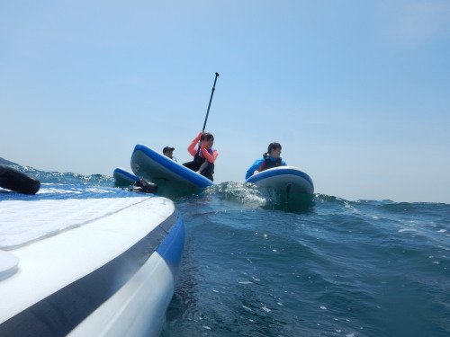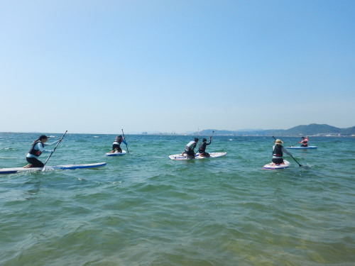 SUPのパドリング練習です。 始めてとは思えない、このパドリング! ナルー効率的なパドリングを分かりやすくレッスンします! 入水のパーズ☆ 20代女子3名様、パパと小学中学生のファミリーさんです。