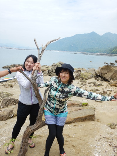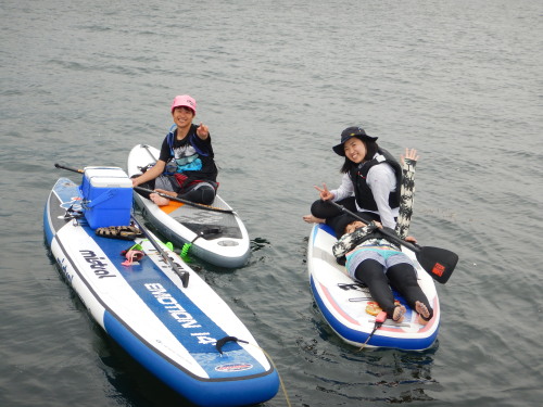 SUP初体験のさやかちゃん、まおちゃん コンディションが良いので、ラクラク 宮島までSUPクルージングです♪