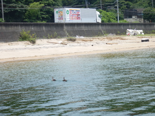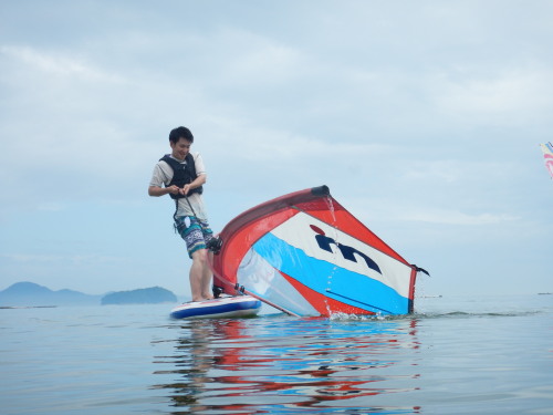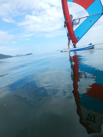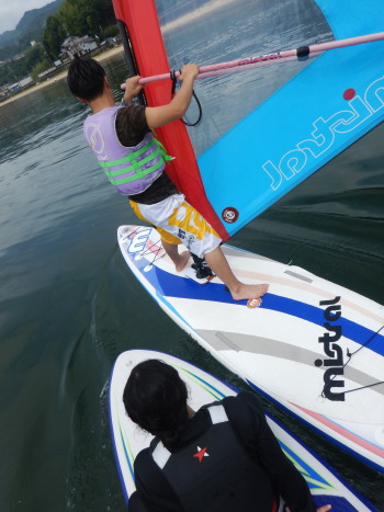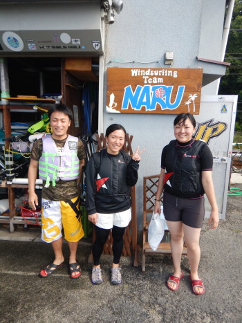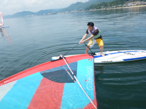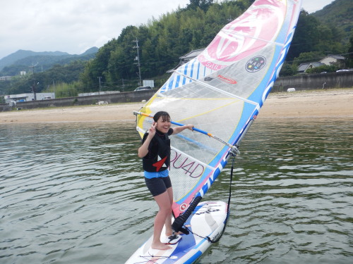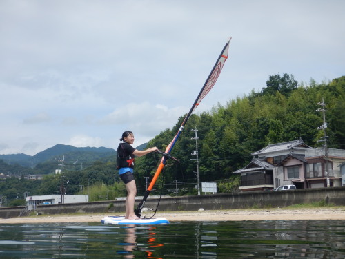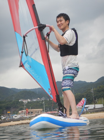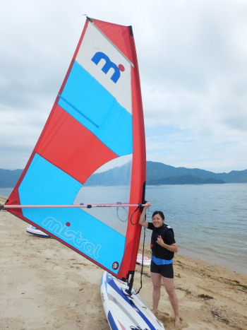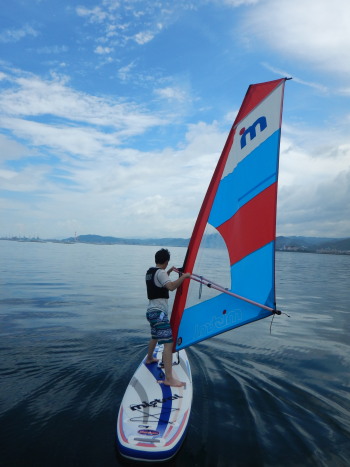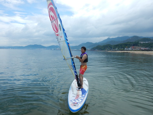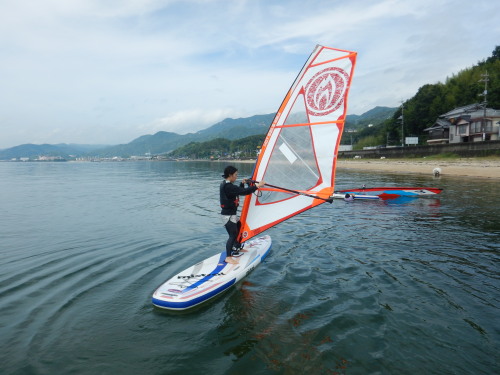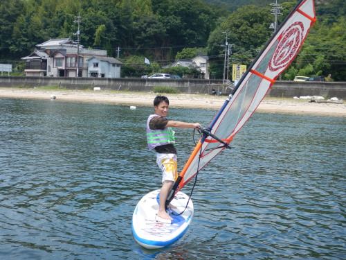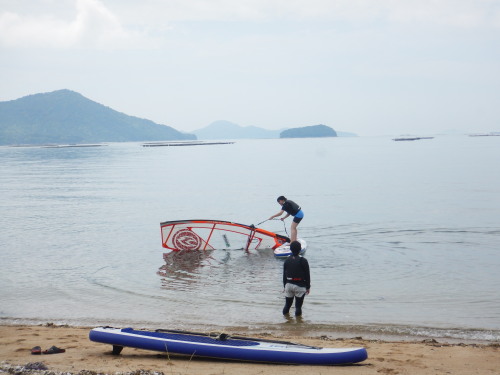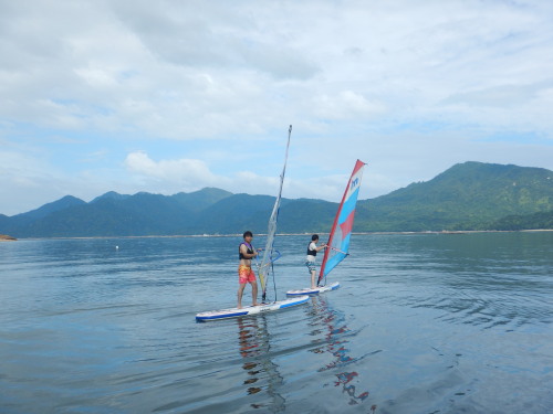 午前中はウインドサーフィンスクールで、昼からは広島大学ウインドサーフィンチームの体験日でした。 風は吹きませんでしたが、今日も楽しく海遊びしました♪ | ||