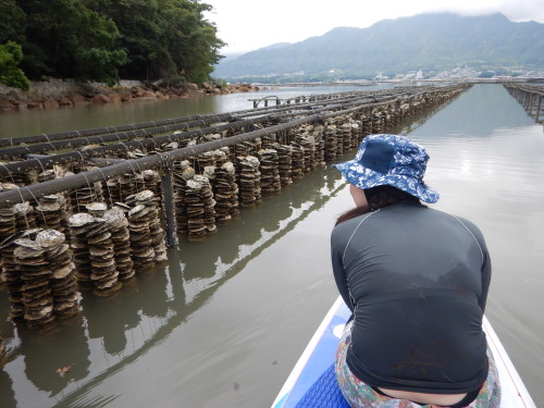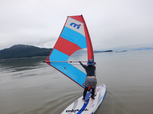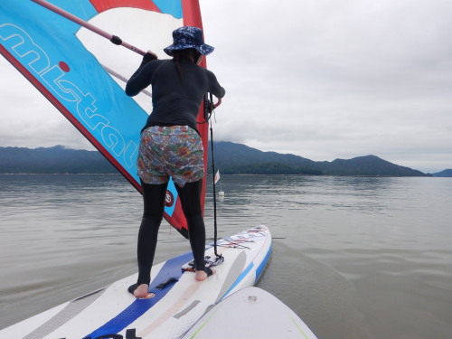 風がないのでタンデムで宮島に出発! ウインドサーフィンとSUPが二人同時に楽しめるのもウインドSUPの良いところです。