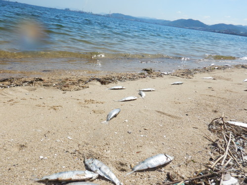 ナルー一面に大量のコノシロが打ち上げられてます。 宮島はチヌが打ち上げられたました。 クルージング中に漁師さんに訪ねると、水温が高いせいだいう事でした。 人間も魚も、今年の猛暑にダウンですね・・・(^_^;)