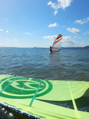 2018 10 20(土) 東のち北東6.3 左からのサイドオン⇒サイドオフで吹きました〜〜! 午前中の早い時間から極上のブローが入りました♪ 14時ごろちょっと吹いた後に、また夕方に北東に変わりプレーニンディでした! ご機嫌なお天気で、楽しくナルー人と過ごしました♪ まだまだ夏真っ盛りです! 暑かった〜〜〜! | ||
