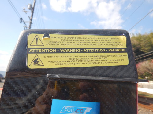 ボードにフィンを付けたら、入らない。 見るとステッカーが剥がれました。 このステッカーの意味は・・・ 剥がして下さい。 剥がした後は、Wind フォイルの安全の責任は、自らで 行って下さい。 みたいな感じす。 Wind foilは危険です。 安全に配慮して、ウインドフォイルを楽しんで下さい! って、ことですかね???